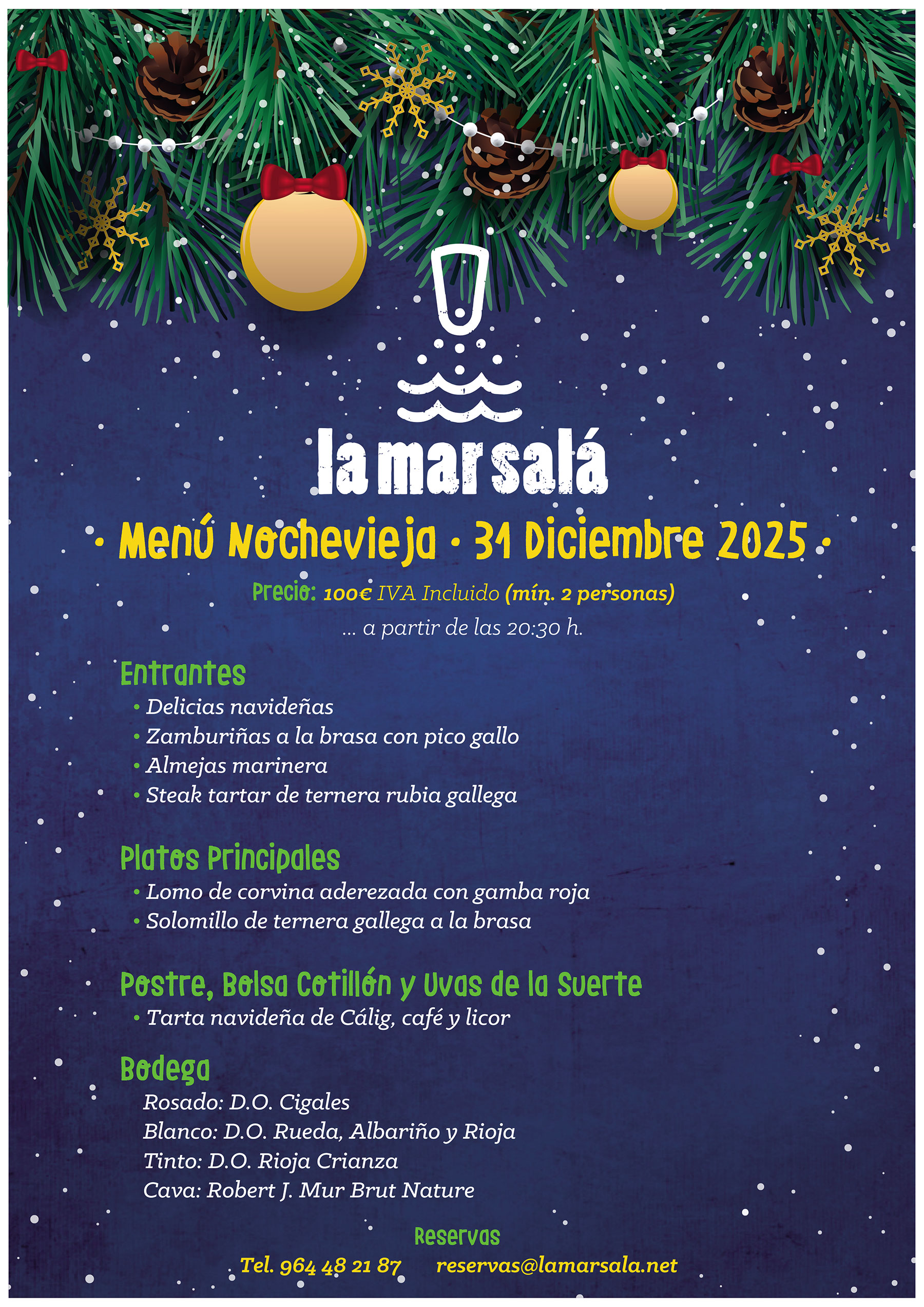 [vc_row][vc_column][vc_column_text] Ya tenemos disponible el menú de Fin de Año. Tenemos plazas limitadas así que no tardes en hacer tu reserva. La cena de nochevieja comenzará a las 20:30h y estaremos abiertos hasta las 01:30h aproximadamente. Para reservar podéis contactarnos por Instagram, llamando al 964 48 21 87...